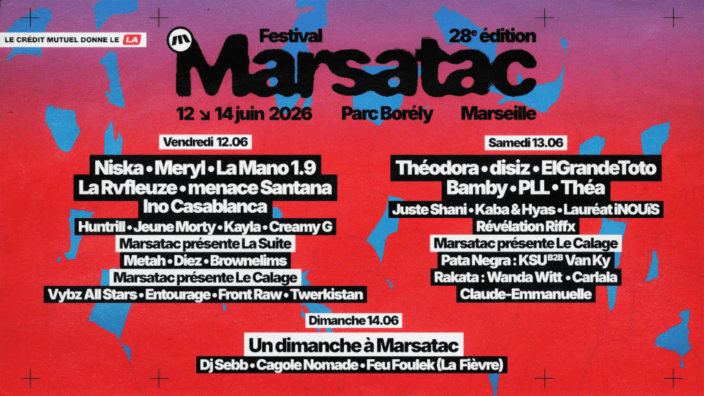 Du 12 au 14 juin 2026, Marsatac retrouvera le Parc Borély pour trois jours de concerts, de basses, de croisements et de chaleur collective. Le festival annonce une édition construite autour de trois scènes — Le Château, Le Calage et Le Virage — avec une programmation qui revendique son mélange : rap, club, dancehall, shatta, musiques caribéennes, sonorités méditerranéennes, bass music, house, techno, jersey, baltimore club ou encore dembow. Bref, tout ce qui fait aujourd’hui circuler les publics d’une scène à l’autre, d’un refrain à un drop, d’un pogo à un pas de danse. (Marsatac)